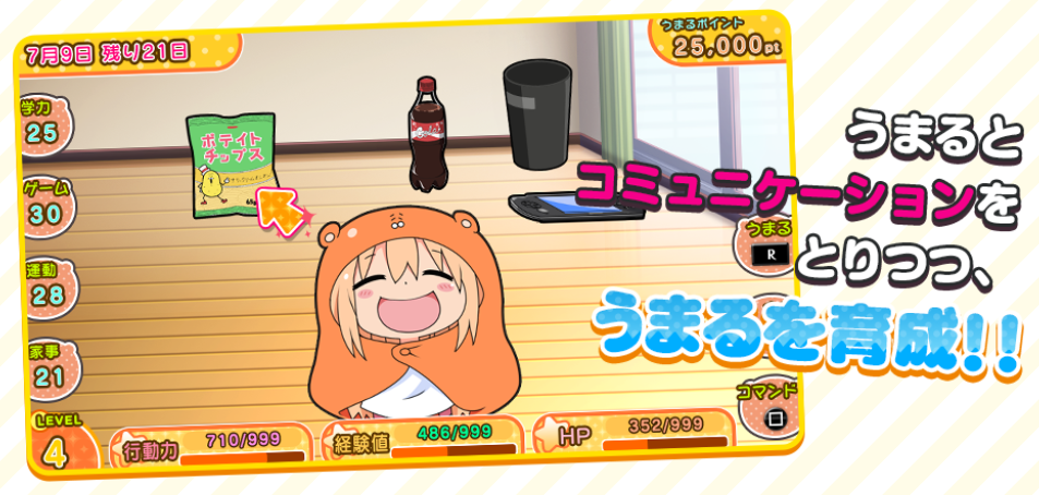 The above shows us a look at the “Upbringing” part of the game. During this part, she’ll be in her famous lazy slouch chib-form, where she’ll lounge around at home. The stats shown on the side are Knowledge, Game, Exercise, and Housework. The bottom shows Active Power, EXP, and HP. You can also see her favorite “poteito chips” and cola in the back, along with a PlayStation Vita on the floor.
