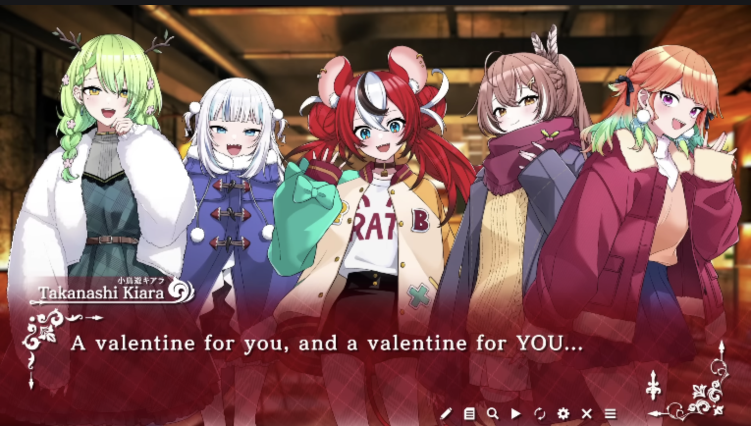 Finally, here’s the Hololive English Valentine’s Day dating sim video starring the members of Myth and Council, as well as IRyS. At the end of about the five minute video, there is a prompt that lets you continue by choosing a “location.” So you can head to the park with Amelia and Kronii, the theme park with Baelz, IRyS, and Calliope, the cafe with Fauna, Gura, and Mumei, or stay behind to help Ina’nis and Kiara clean. At the end of those videos, you again get a choice to continue on to a third video with the Hololive Vtuber of your choosing.
