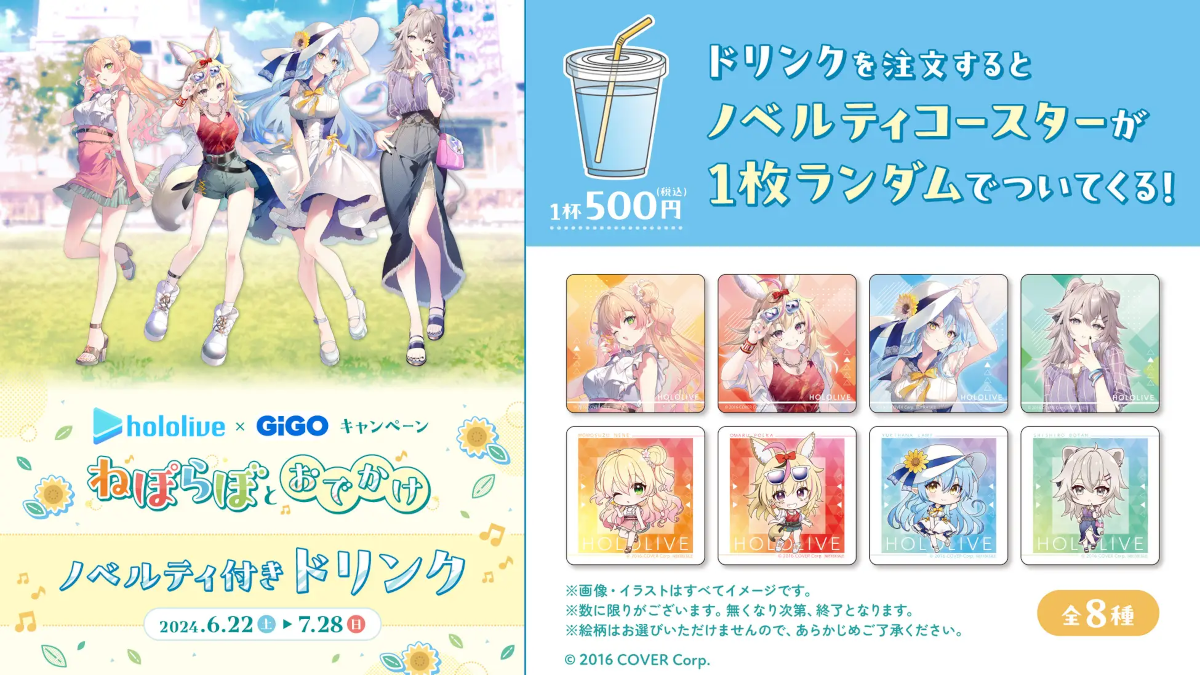 The new hololive NePoLaBo merchandise and menu lineups will be available at GiGO outlets across Japan from June 22, 2024, to July 28, 2024.