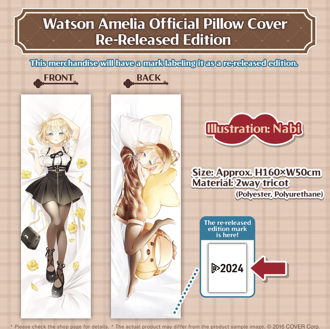 The Amelia Watson dakimakura was originally a part of the Hololive Vtuber 2023 Birthday Celebration merchandise, with the body pillow cover appearing alongside a Bubba lamp, task manager, and magnet sticker sheet. It is about 63 inches long (160cm) and over 19 inches wide (50cm). It is nearly identical to the original release, as it features her in her birthday outfit on the front and her traditional detective attire on the back. It costs $72.