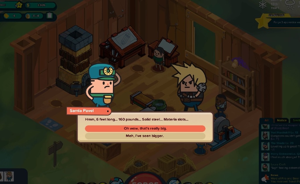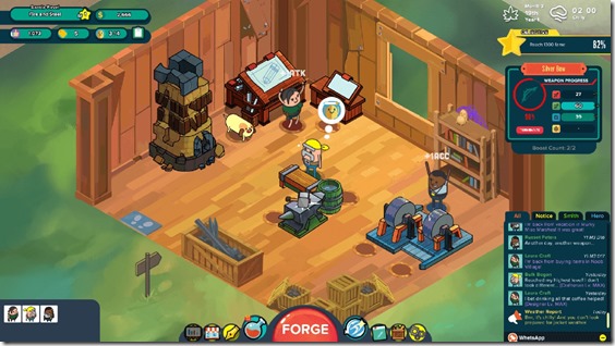 We always wanted to make a simulation game. Even while working on our mobile project we threw ideas around about how we would do a sim game. Our team members really loved games like Game Dev Story, Weapon Shop De Omasse and Game Dev Tycoon. It was around April/May last year when we were reaching the end of our other projects that we decided to really work on one! It all began with our executive producer (Don), producer (myself) and art director (Julian) sitting at a coffee shop discussing new possibilities and what we all agreed on was that a team simulation game about making and selling weapons would be awesome. The RPG references was a natural part of it since heroes in any RPG world needed weapons! The Potatoes came later, when we were trying to figure out the right art style.