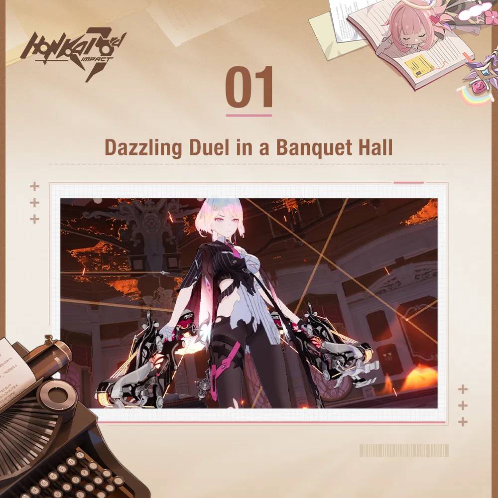There are seven images total of Lantern and the area in which players fight her in Honkai Impact 3rd Part 2 that were shared. The first images were designed to give a sense of the space. It shows the Masquerade Corridor where people fight her, and how it was designed to look like both a dance hall and offer opportunities for her to attack both hand-to-hand with Taijutsu and from afar with guns. Images were also shared showing how she’ll transition between melee and ranged attacks, with a note that she does need to pause to reload sometimes. The final image was her concept art, which was designed to show how she can be calm, but that she also fights fiercely, wholeheartedly, and without concern for herself.