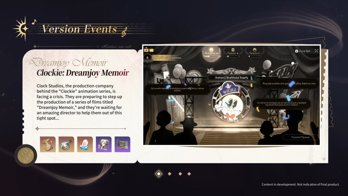 The event itself will involve editing several Clockie scenes by dictating the length of story snippets. Each snippet effects the overall emotional score of the scene in a different way, and by making snippets longer or shorter players will attempt to reach the targeted amount. There will also be sections where the player controls Hanu, a photography activity, and a puzzle area that utilizes the Dream Bubble mechanics similar to those already found around Penacony.