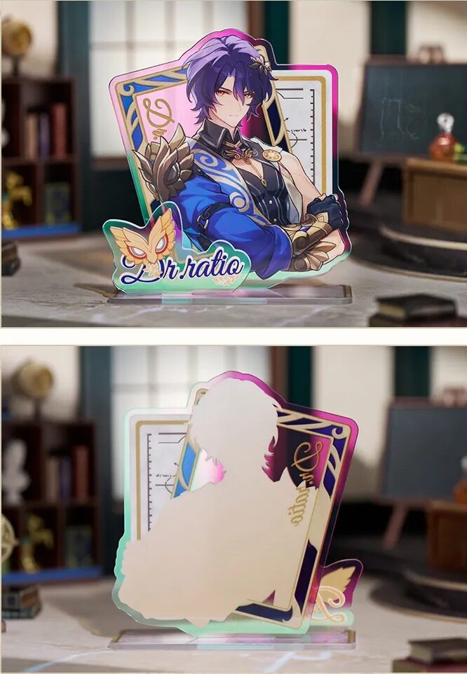 The Dr Ratio Nendoroid figure is approximately 100mm (or about 3,94 inches) tall and is articulated. The figure comes with three different faces plates, as is common with Nendoroids. These will be a standard smiling face, a thinking face, and a closed-eyes face plate. In addition to the faces, the figure comes with 4 other parts, including his signature Book of Truth, a rubber duck, a pistol, and a bathtub. The bathtub pose appears on a Light Cone in-game.