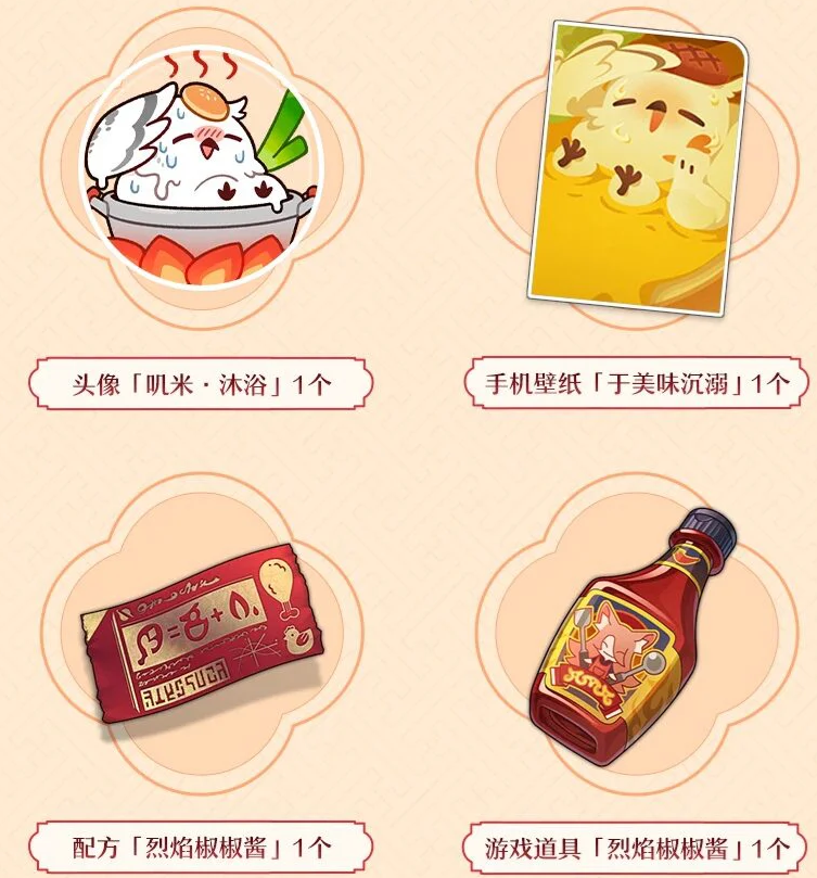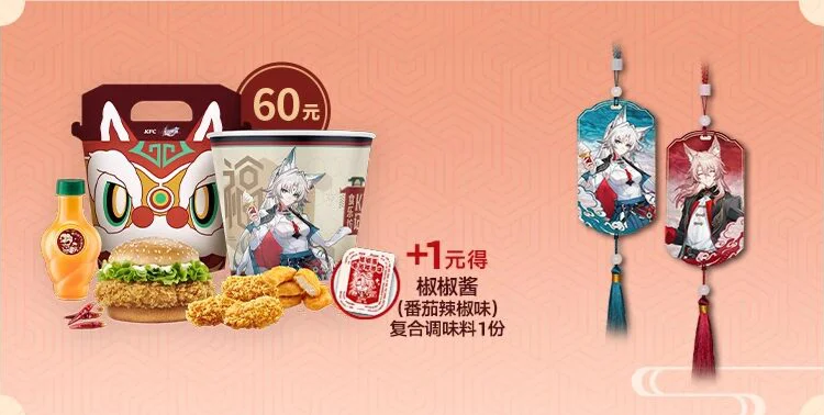 For starters, you can purchase goods like badges and red envelopes. There are also two types of combos you can order in-store during the Honkai: Star Rail KFC campaign. The first one is for the New Year. This combo costs 60 CNY ($8.20). It comes with a set of acrylic straps (depicting Feixiao and Jiaoqiu), as well as an in-game sticker and smartphone wallpaper. You will also receive a spicy sauce item, along with a recipe for it.