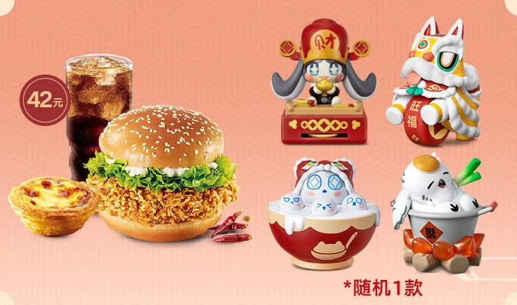 The other combo costs 42 CNY ($5.75) and it comes with a burger, egg tart, and drink. Like a Happy Meal from McDonald’s, this combo will come with one of four different toys. You cannot choose which one you get. All of the toys are Lunar New Year-themed, so they have plenty of red and lucky characters. The variations are: Pom-Pom, a Diting, a Wubbawoo, and Owlbert.
