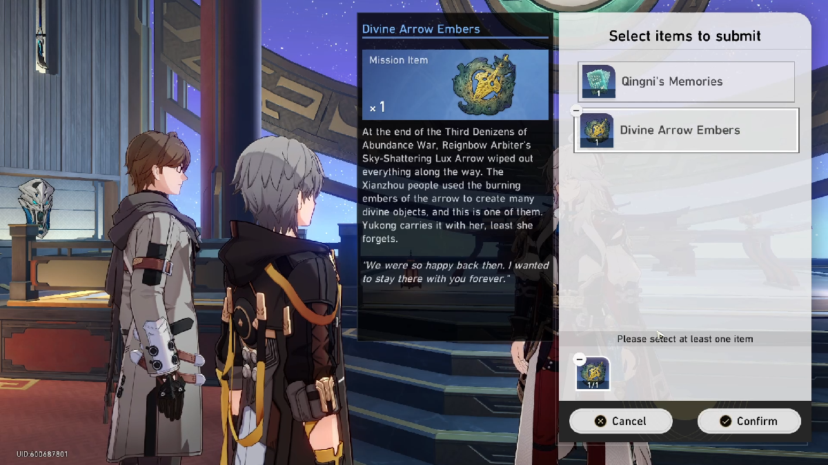 - When speaking with Jing Yuan in the Seat of Divine Foresight, hand him the Divine Arrow Ambers.