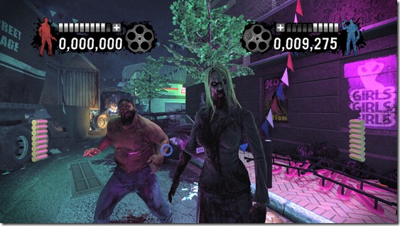 On the topic of boss fights, the bosses in Overkill are some of the most disgusting creatures I’ve ever seen in a game. Ranging from two circus freaks fused together to a corpulent, bile-spewing, boil-covered swamp things, it sometimes makes you wonder if the people at Headstrong Games who created them have some issues to work out . While these boss fights are generally pretty fun, they often feel too easy, falling into readable attack patterns that can be easily avoided the first time you see them. Even so, the spectacle and post-boss dialogue makes the overall experience rewarding. All of this remains intact in the PlayStation 3 version, with the requisite HD improvements and extra content. However, outside of the improved visuals, the extras in the re-release aren’t exactly all that great. The biggest addition is probably the two bonus chapters focusing on strippers Varla Guns and Candy Stryper. While Varla had a central (if unplayable) role in the original game, Candi is a completely new character. While mechanically, these levels don’t differ at all from the levels with Detective Washington and Agent G, they’re missing a certain spark. Part of the fun of the original game was the interplay between Washington and G as the levels went by. Sure, the dialogue was profanity-ridden and cheesy, but it was done in a clever way. On top of that, you could see the two becoming friends as you progressed through the game. Sure, it was just like every buddy-cop movie ever (G’s the straight man, Washington’s the loose cannon), but it was done well, and the characters surpassed their clichés.