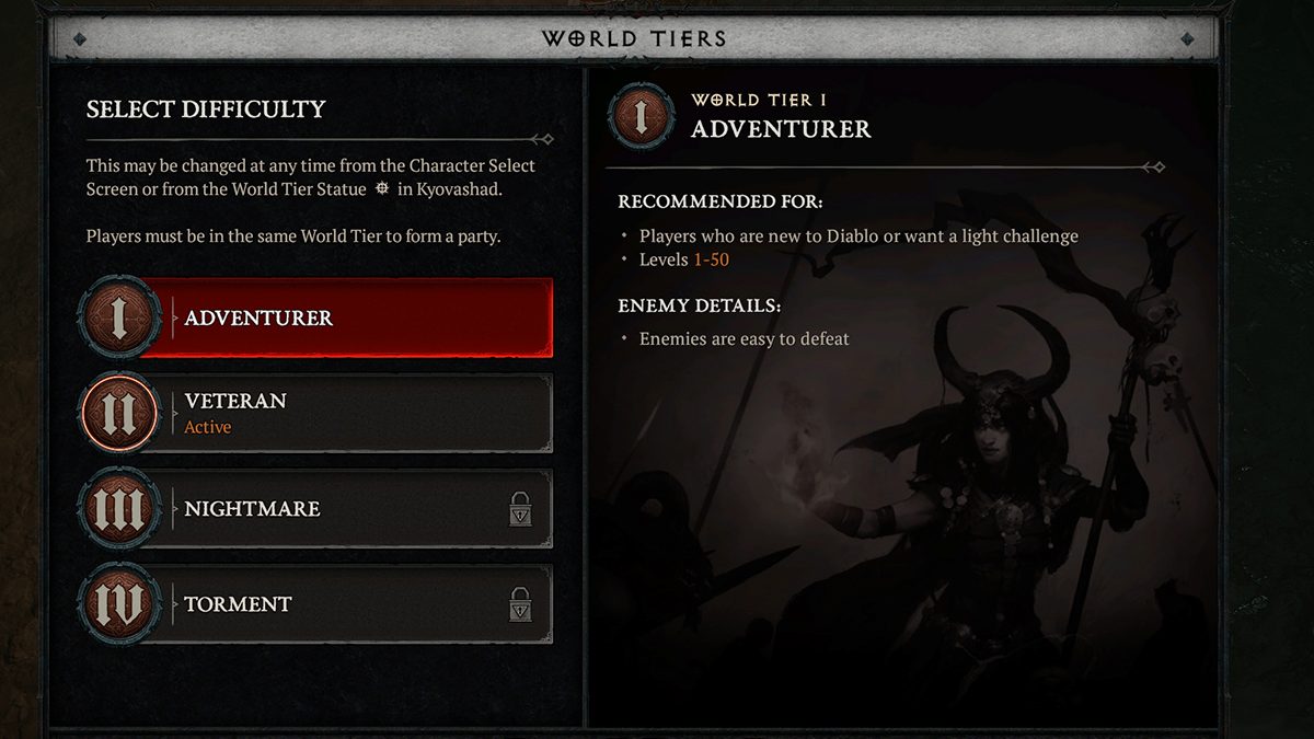 There are four World Tiers in Diablo IV to choose from. When I first started with my early-game Necromancer build, I found Adventurer to be a little too easy, so I changed over to Veteran. Choose whichever World Tier you feel most comfortable with! Below is a list of every change each World Tier makes to the game and how to unlock each difficulty level:- World Tier I: Adventurer – Enemies are easier to defeat.