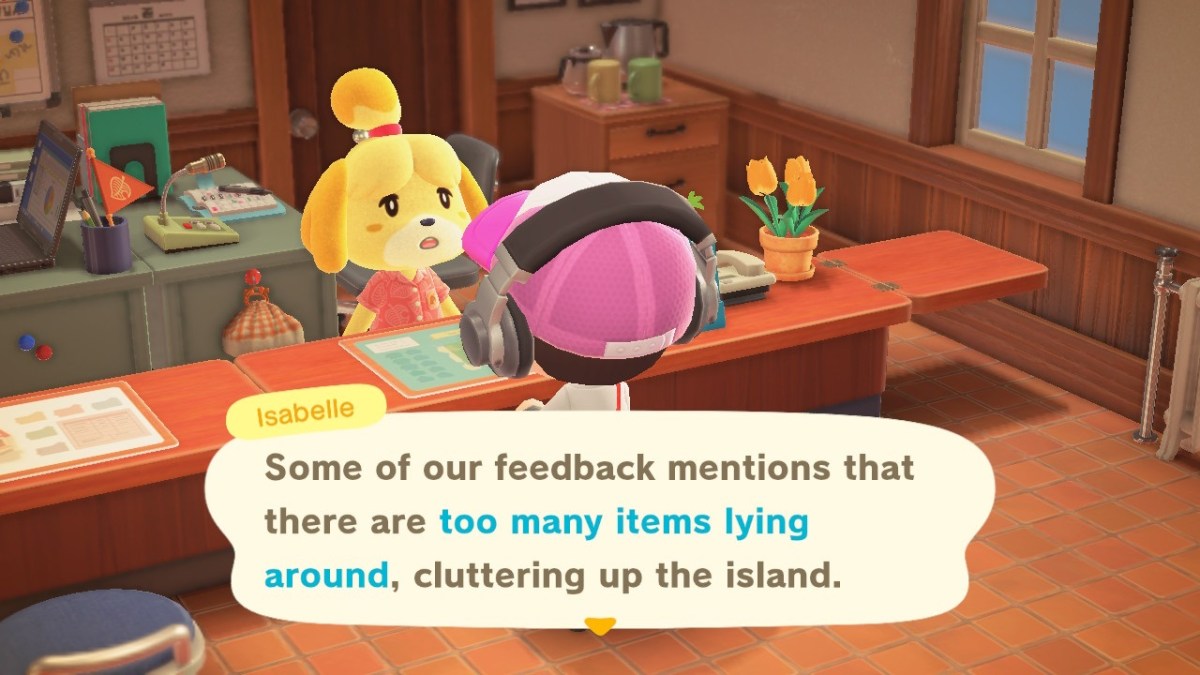 Next, you want to clean up any stray items lying around. I’m not talking about furniture or DIY recipes you have placed. I’m referring to items you might have dropped for villagers or because you needed to temporarily make room. Pick up weeds, grab smaller rocks next to big rocks, and pick up branches. This will conflict with people who have “free” or “trade” areas set up, so keep that in mind. Have a weed pulling party. Temporarily place all of the items you were going to give away in your pockets. Then, ask Isabelle to rate your home.