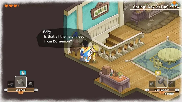 In offline co-op mode, 1P and 2P share the same stamina bar. This is likely to prevent players from cheesing the more strenuous activities around the farm. Breaking boulders and cutting down trees eat up a lot of stamina, after all. You do not have to share tools though, so both Noby and Doraemon can work on the same task simultaneously. A caveat in the offline co-op is that the game does not offer a split screen perspective. Both players have to exist within the same screen. And since the game will prioritize Noby (1P), the player two will have to go where player one wants to go. When I played this in offline co-op with my roommate, she took 1P (Noby), because she was sitting on Noby’s side of the screen. That left me at her mercy in terms of what we did for the day. Several times I found myself charging fruitlessly into the side of the screen while she explored Illuma or chatted with the townspeople. In houses, the game will actually block Doraemon from view if Noby is upstairs while Doraemon is downstairs. Mining, farming, and fishing are the best ways to use the offline Doraemon Story of Seasons: Friends of the Great Kingdom co-op. However, since both players share a stamina bar, offline co-op means that each player will not be able to mine or farm or fish as much as someone playing in single-player mode.