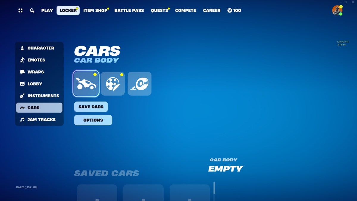 Now that you’ve linked your account and redeemed all of your Rocket League cosmetics in Fortnite, you can now head over to the ‘Locker’ screen and select the ‘Cars’ tab as shown below.