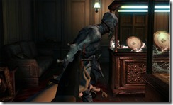 Resident Evil: Revelations has boxy environments more akin to the original game than the open fields in Resident Evil 4. You don’t have much room to maneuver or dodge. The dining room was the first wide area in the demo, although tables acted as obstacles. Capcom hid a Bio Sensor in this area, which players can use to find extra items. You scan a room the same way you would use a gun, hold R to bring up the scanner and press Y to lock on to a hidden item. Using the scanner, I found extra ammo, green herbs, and grenades in the demo.