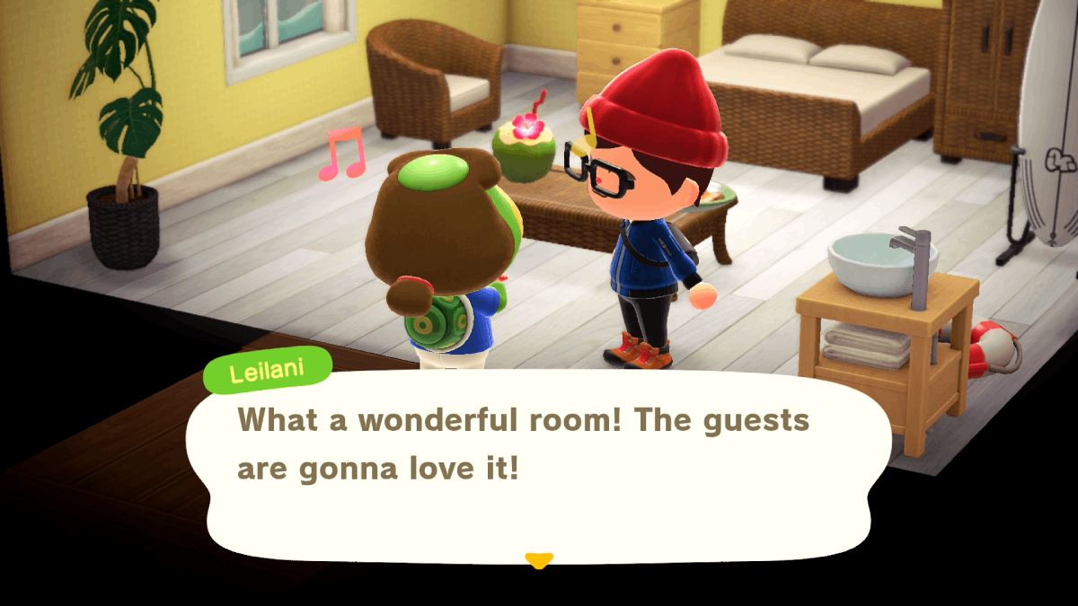 In addition, random villagers will arrive and stay at your hotel. They can be visited at any time by using the stairs at the back of the lobby, which provides an overview of all the rooms. Some of these guests can also be seen wandering around your island, so you’ll regularly have a chance to meet some new faces.