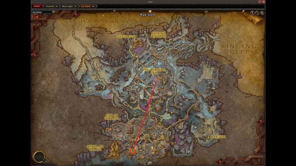 To access the entire raid proper right away you’ll have to join a raid group (you can use the premade group finder), and travel to the raid entrance. The entrance to Nerub-Ar Palace is slightly southwest of the Weaver’s Lair in Azj-Kahet. The map below will point you in the right direction.