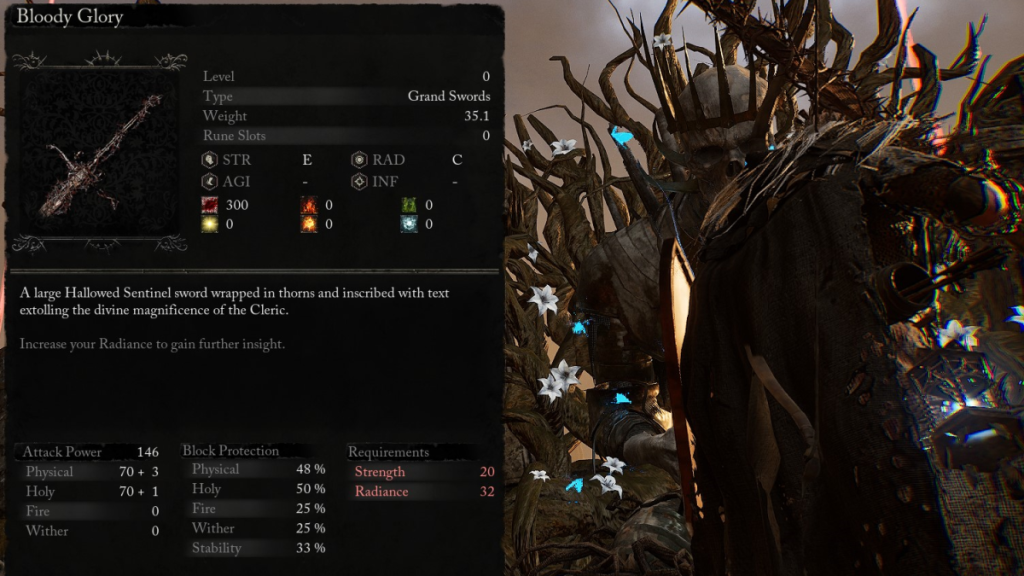 While Bloody Glory is by all accounts a powerful weapon, it is very clearly meant for stronger characters. A player must have not only 20 Strength but a whopping 32 Radiance to use Bloody Glory. It might be a long time after acquiring the sword until you are able to use it. However, when you finally do muster up the stats to wield the blade, you will take a huge step above other foes in Lords of the Fallen.