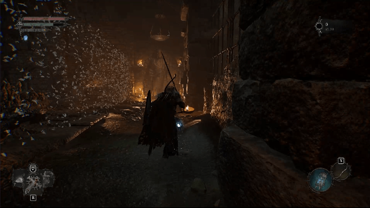 You will go down the tunnel and find a steel gate to the left that you cross using your lantern. Go to the left and cross the gap along the wood planks while dodging arrows from enemies. On your left, there will be a tunnel leading to a chasm. You will have to enter the Umbral Realm to cross it. Go directly ahead to reach the path outside, but avoid the powerful knight in the pit on the right.
