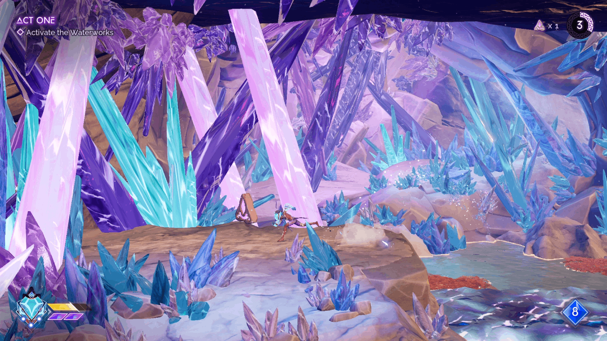 Don’t freeze the next river, however. Fight the current and dash through the waterfall at the end. Continue along the path and dash through a second waterfall. However, turn around and freeze this one. Wall jumping up from here will take you to a switch that opens the trapdoor from earlier, unlocking a shortcut for later. Return to the main path and you’ll soon reach an elevator that leads into the mines.