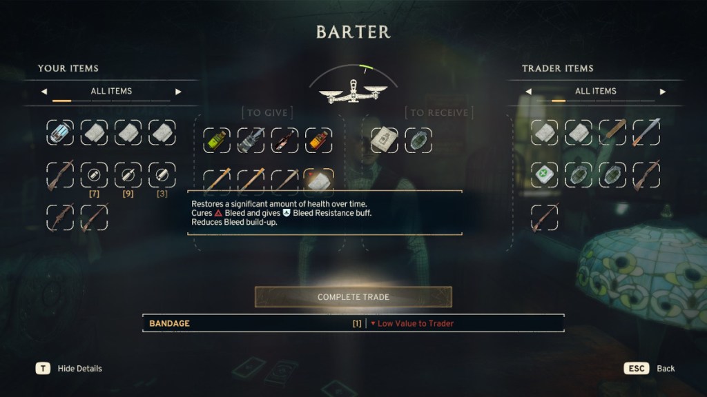 Both parties must agree to a trade for the barter to be complete. The scale in the center visualizes how much the trade favors one person or the other. Further to the left means it favors you, further to the right means it favors the Trader. If the trade is too much in your favor, you’ll have to add more items to the exchange in order to appease the Trader. In many cases, you’ll probably have to give many more items than however much you’re getting in return.