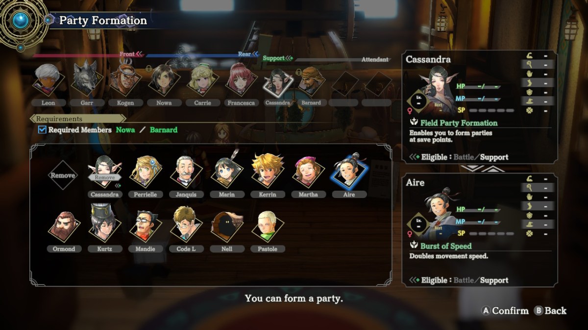 Aire isn’t a party member. She’s a support character. If you set her, Nowa will move more quickly around areas. If you’re not okay with his current movement speed, then go ahead and add her, but I think Cassandra is a better support character.