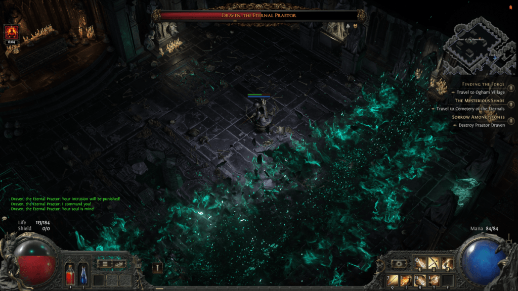 The fight with Draven in Path of Exile 2 starts off simple enough. He has two moves, a wide swing that fires a fan of green projectiles, and a multi-part combo. Ranged characters should be able to kite him fairly easily, while Melee uses will need to dodge and block his combo and get behind him to avoid the fan.