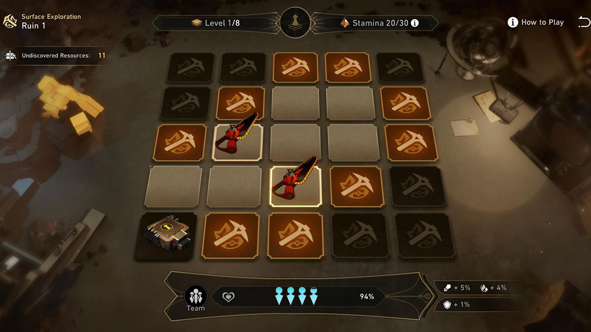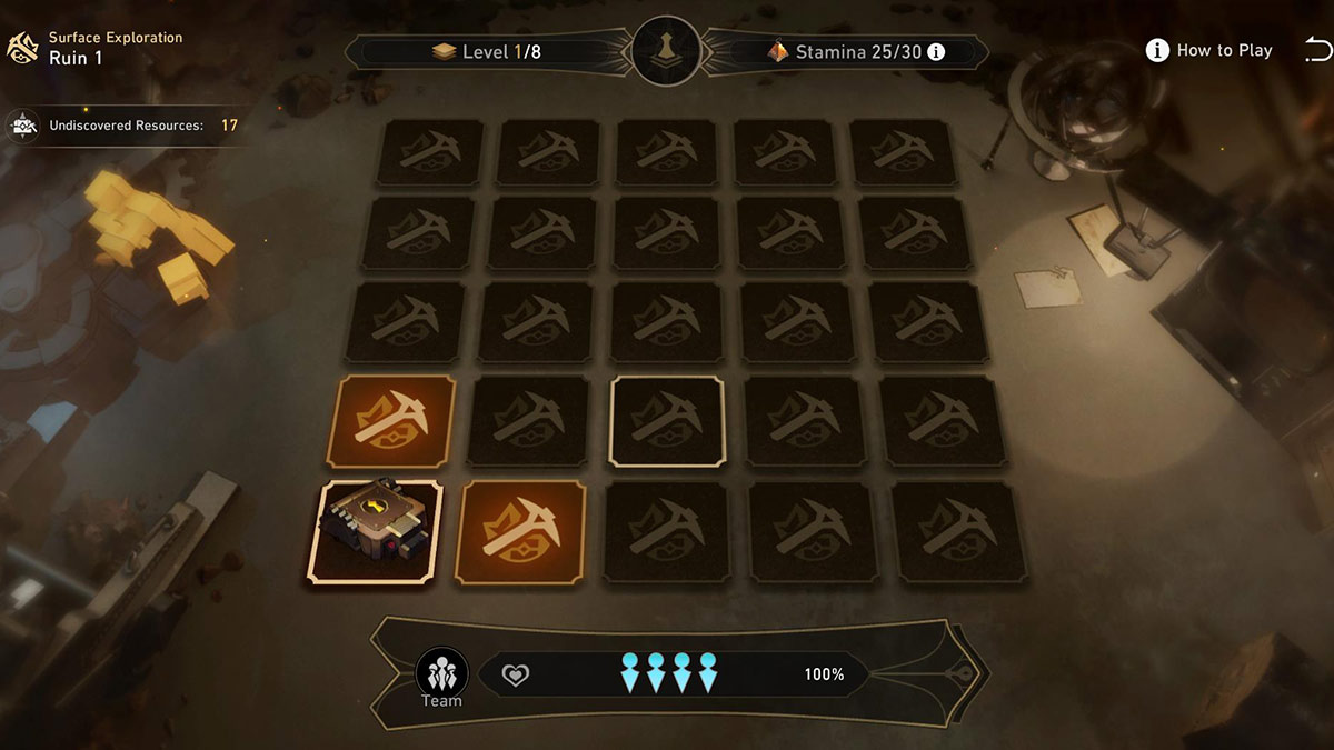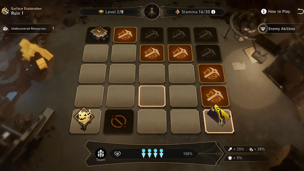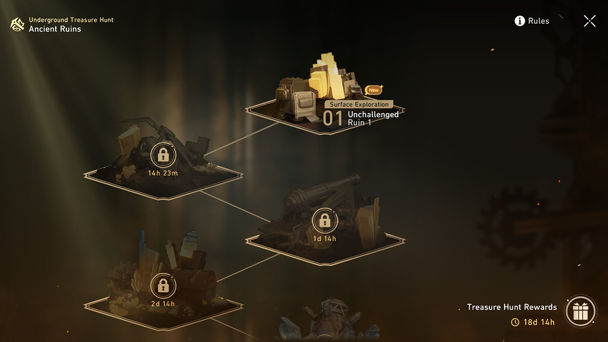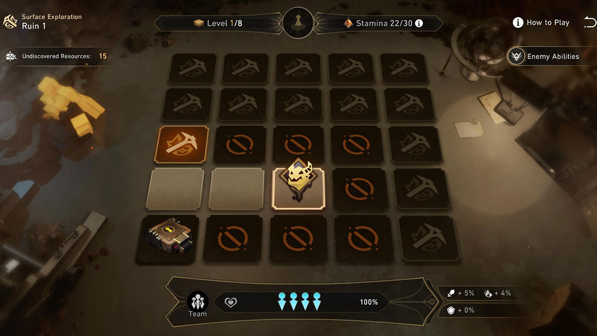There are five ruins in the Underground Treasure Hunt event, each with two modes of exploration that need to be cleared. In “Surface Exploration” mode, you travel through eight levels and face off against easier enemies. In comparison, “Deep Exploration” only has six levels but has more difficult enemies and obstacles to clear. A new ruin will open every 24 hours starting on August 9,2023, with the final ruin going live on August 13, 2023. You will be loaded into a ruin with levels made up of squares. Each square you click can reveal an enemy, stamina provision supplies, an ancient armor, an ancient weapon, or a relic. The goal is to collect as many relics as you can while also searching for the key required to progress to the next level. Sounds easy, right? Well, any time you perform an action, such as picking up an item, revealing a square, or fighting enemies, you will lose a stamina point. And if you deplete your stamina completely, your team’s health will start to drop until you lose. Unfortunately, each run of the Underground Treasure Hunt is completely random. This means there is no set path to avoid enemies. That said, it is fairly easy if you have a strong enough team. The best strategy is finding each level’s key as quickly as possible so that you can budget out your stamina points. Even if you haven’t found every relic yet, it’s sometimes better to just move on to the next stage to preserve your stamina bar. Defeating enemies is also helpful as doing so will automatically give you three stamina points back.