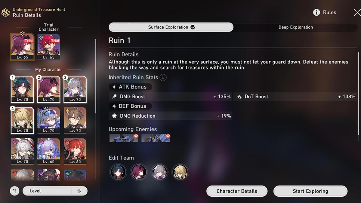 The Underground Treasure Hunt features enemies of every element type, so there are many team options you can go with. At the start of every level, you can see which enemies will be on the stage to help you choose accordingly. If you have Luocha, he’s easily one of the best units for this mode as his automatic healing ability can rescue your team in a pinch when facing off against tougher enemies deep inside the ruins. Below is a list of recommended teams for the Honkai: Star Rail Underground Treasure Hunt: