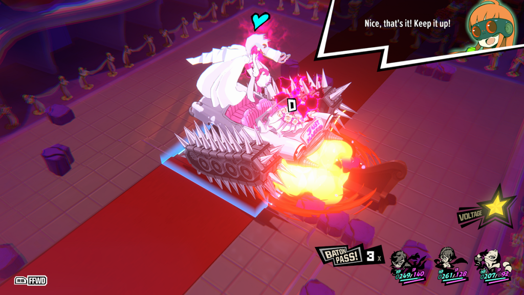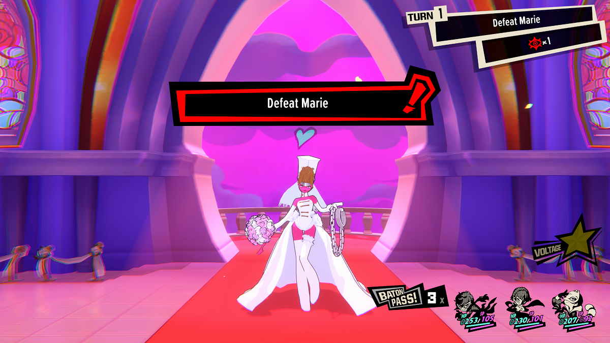 Survive a couple of turns during this phase, staying in cover and avoiding any of Marie’s onslaught. Soon, the Phantom Thieves will hatch a plan to lure Marie into the center of the arena to destroy her vehicle.
