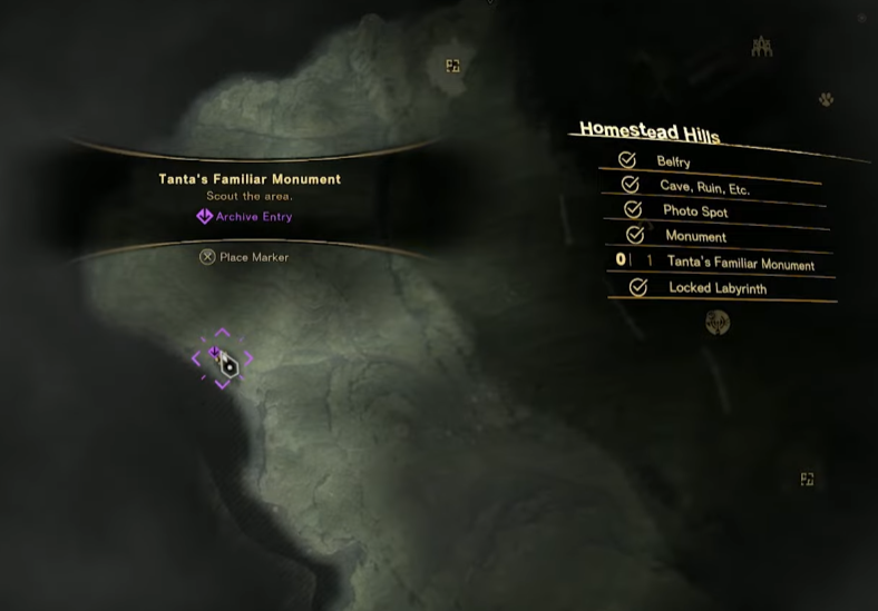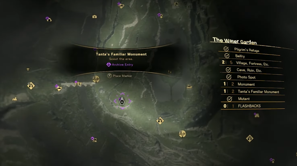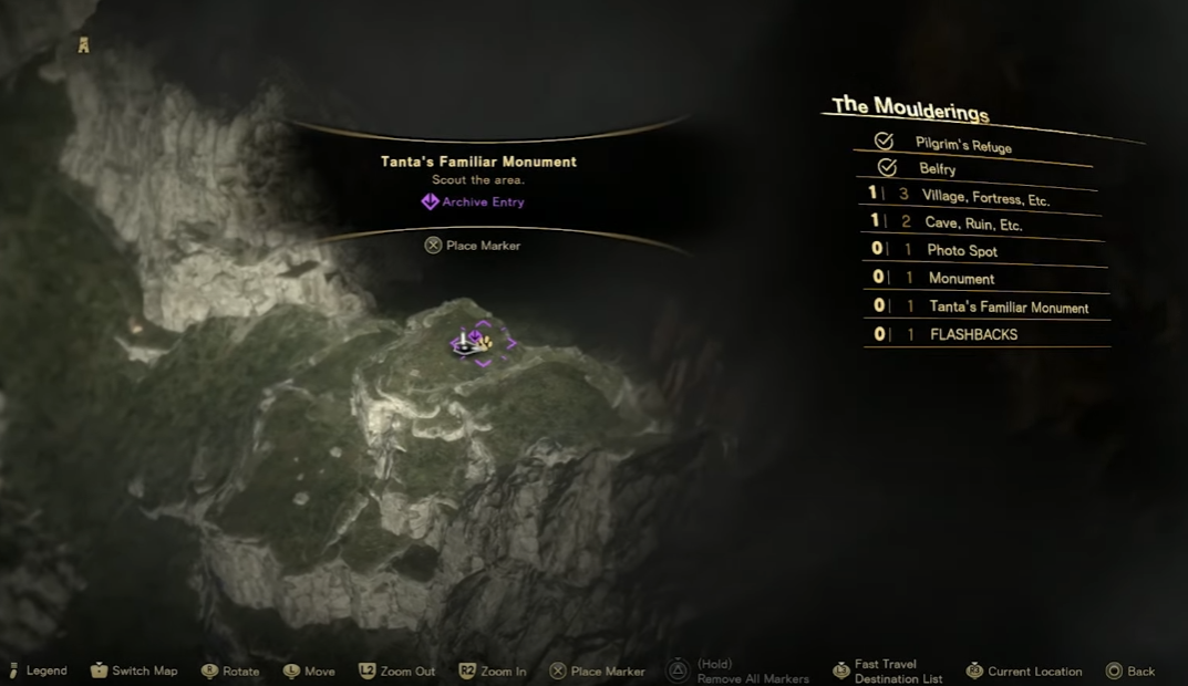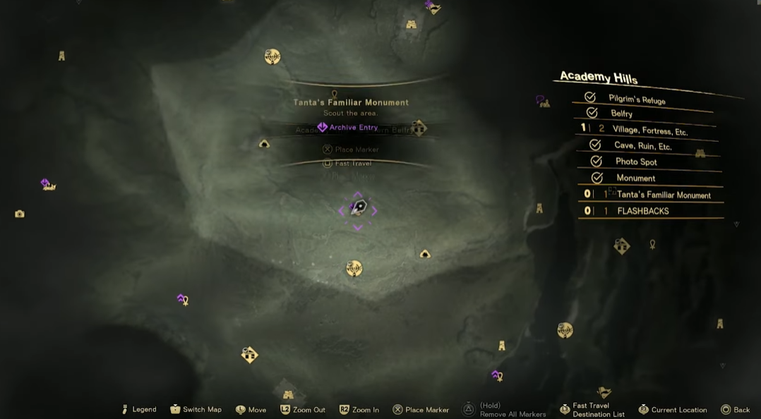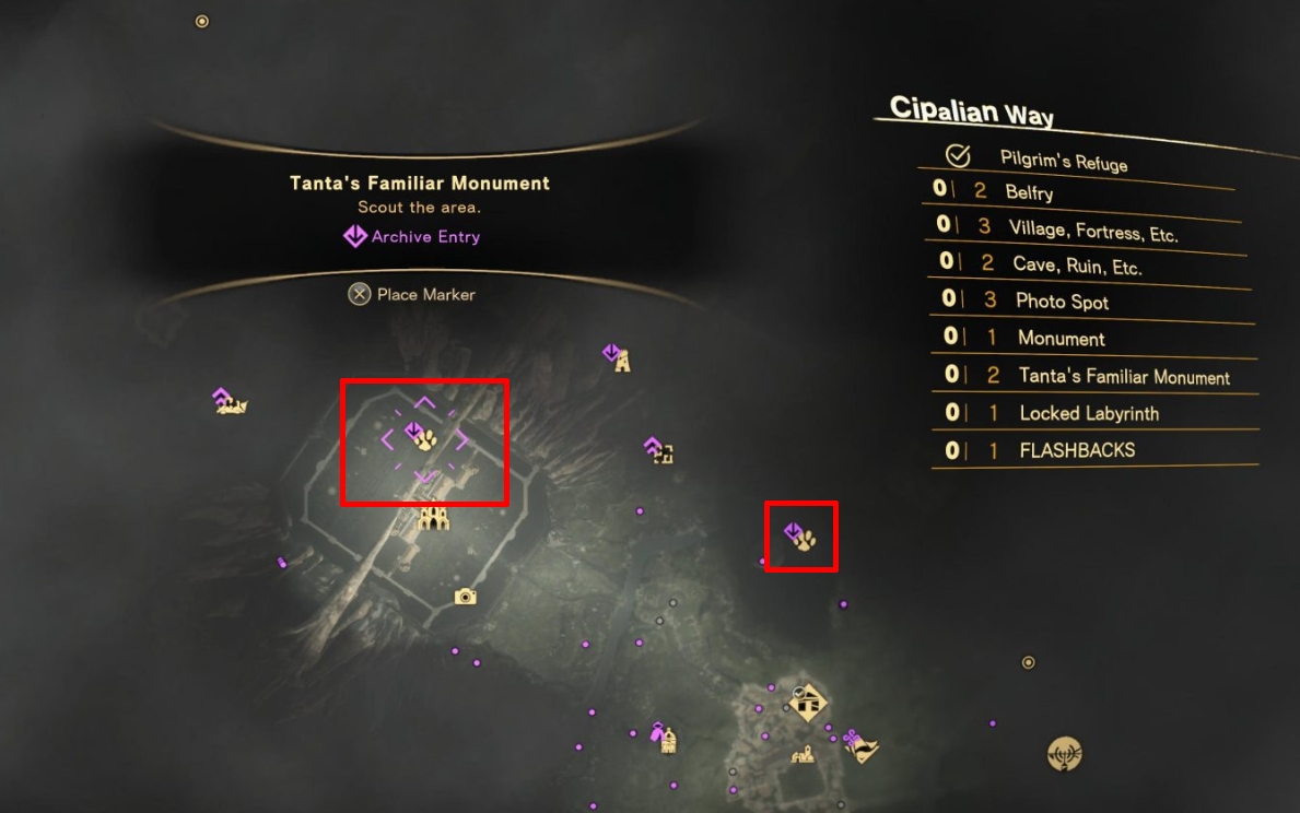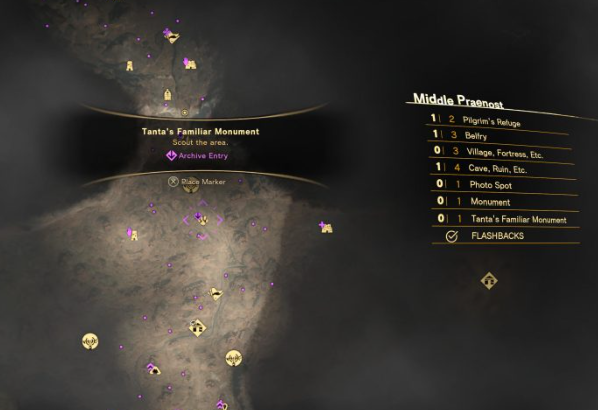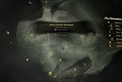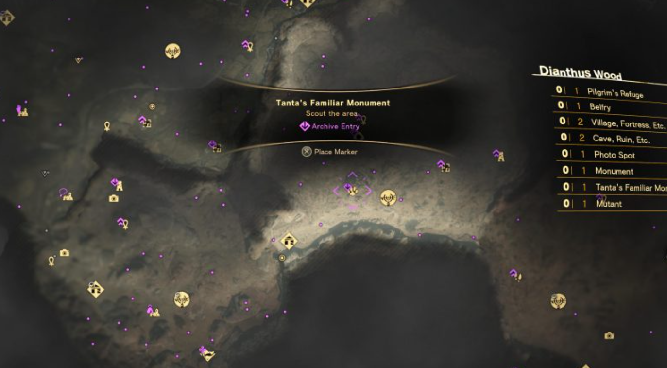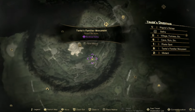 Each Tanta’s Familiar monument is indicated on the map by a yellow cat’s paw icon. A small purple flourish will display if you haven’t befriended a monument’s cat yet, making it easy for you to keep track of monuments you’ve already hit up. The larger map legend will also indicate if a given map region has a Tanta’s Familiar monument in it. So if there is one and you can’t see it on your map, explore a bit further and see if you can’t find it. Unlocking Belfries and visiting Refuges will also add more locations to your map. The rest of the guide will show the map locations of each of Athia’s Tanta’s Familiar monuments, arranged by their map region. Hit them all, and you’ll quickly earn the