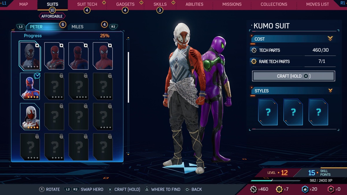 You can also craft different variants of some suits with even more currency. You can get currency like Tech Parts and City Tokens from completing side activities in the game like Photo Ops, Prowler Stashes, Spiderbots, and more.