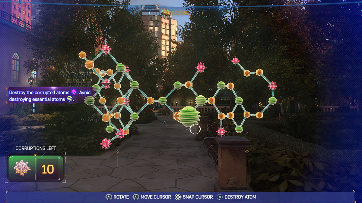 To complete the puzzle, you need to destroy the red corrupted atoms. The trick here is to only click on the red atoms if a yellow orb is attached. If a green atom is connected, it will be destroyed, and you will have to start over again. You will also need to click on the yellow atoms in certain areas of the strand. However, be careful because yellow spots in the puzzle destroy up to two nearby atoms simultaneously. So, for example, you will want to click a yellow atom with a red atom on each side of it, as it will eliminate all three at once. The puzzle will be finished when only green and yellow atoms are left.