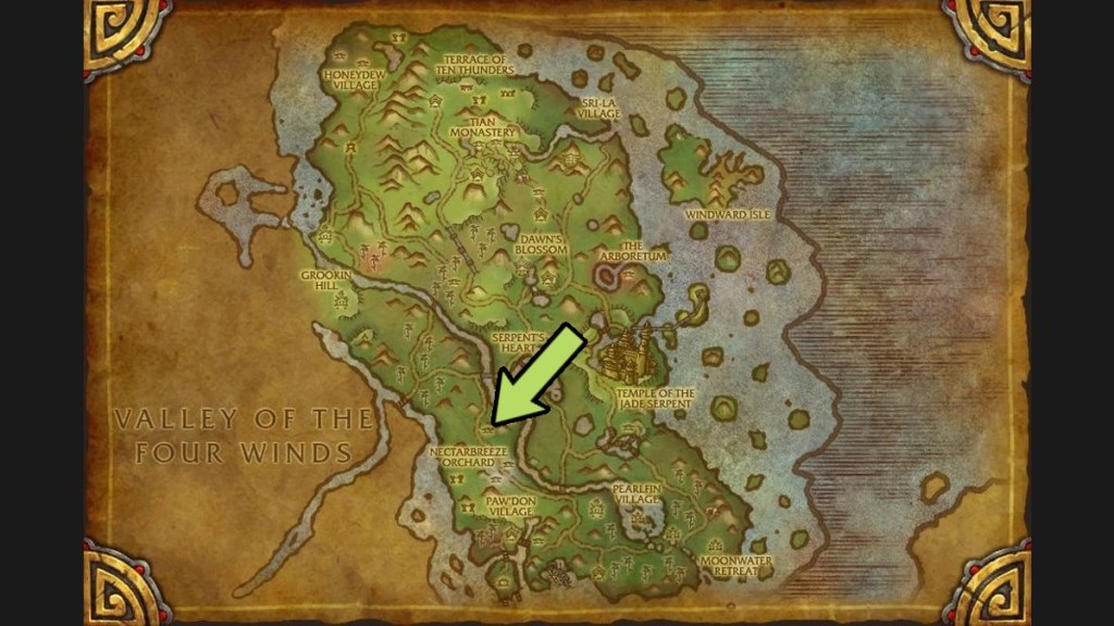 Return to Orgrimmar or Stormwind, then take the portal to the Jade Forest in your faction’s respective portal room. Once in Jade Forest, fly to Serpent’s Outlook flightpoint, marked on the map above. Once you arrive, use the Torch of Pyrreth on the two graves behind the flightmaster to summon Gizmo.