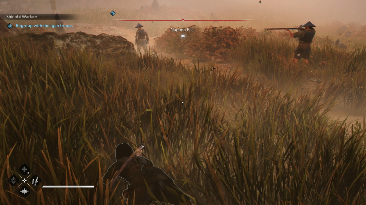 In the starting area, there is a bandit patrolling. Stick to the left and move between bushes when he’s looking away until you reach the river. Don’t worry about the other two, they’re too distracted.