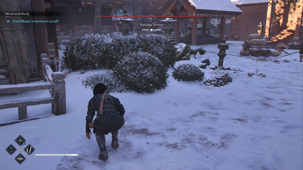 After the cutscene, go and speak to Mitsu and you’ll get a marker for the shrine. Follow it until you see people running away, mentioning that bandits have taken over the shrine. You’ll need to stay out of their way to retrieve Mitsu’s scroll. There are two main areas you need to worry about, the entrance area and the main shrines.