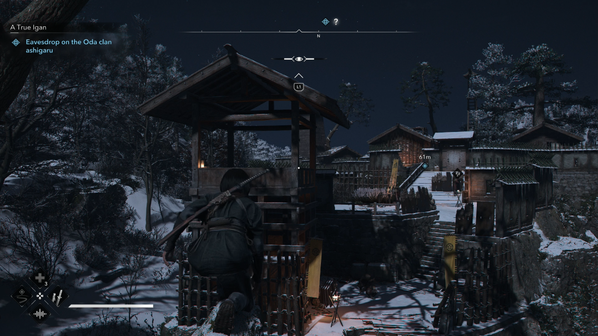 This quest sees you infiltrating an outpost in the snowy mountains under the instruction of Momochi Sandayu. Speak to him at the top of the stairs before returning down the hill and climbing the ladder on the left.