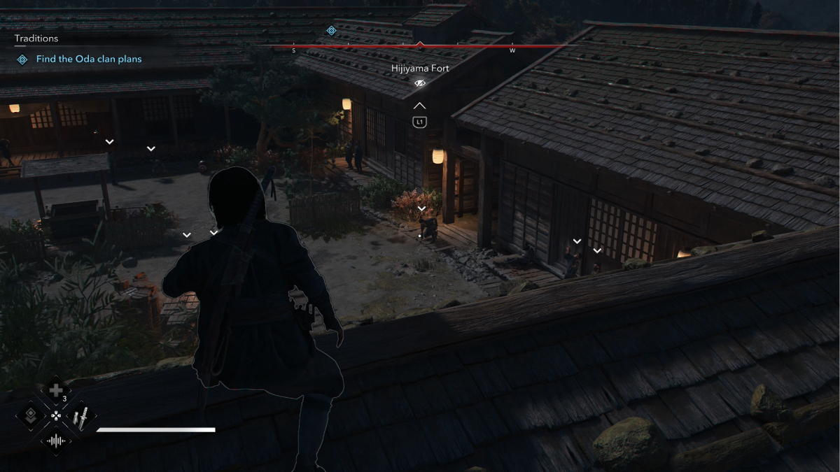 Eventually, you’ll be placed at the bottom of a fort with Naoe’s father. Head up the scaffolding and follow the hill upwards. You can find a tree at the top that allows access to the fort. After another scene with your dad, the stealth mission begins.