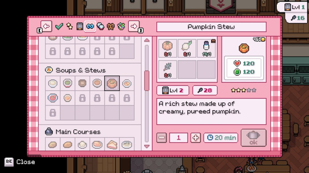 Underneath the ingredients list are two small boxes. These boxes denote what level of kitchen, and what level of cooking skill you need to cook the recipe, respectively. Finally, all the way at the bottom of this menu, is an option to change how many of that specific dish you want to make, and a timer explaining how many in-game minutes (or hours) it will take to make them. Obviously, increasing the amount of times you want to cook the recipe will also increase how many ingredients you need. You can’t cook if there isn’t enough time in the day to do so. If cooking would take too long, consider lowering the amount of dishes you want to make.
