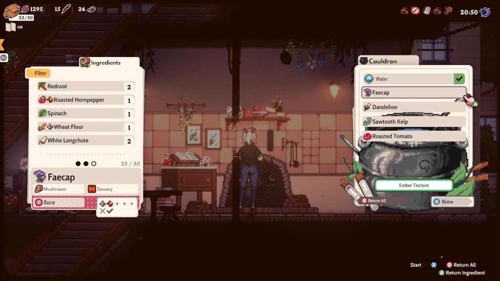 The Ember Tincture has four key ingredients: Faecap, Flower, Salty, and Roasted. Feacaps can be found by traversing the map and picking up the natural ingredients of the land. It may take a few in-game days to find a Faecap, but you will eventually come across one. I tended to see it in more grassy terrain areas.