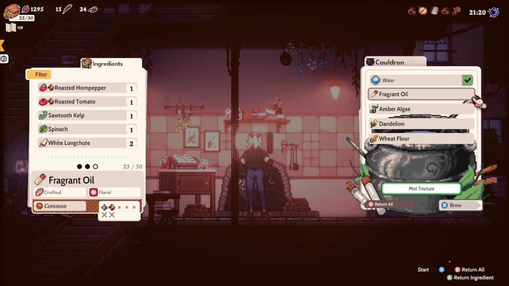 The Mist Tincture has four essential ingredients: Fragant Oil, Amber Algae, Flower, and Ground. Fragrant Oil is a crafted item that requires you to make it separately, but it is relatively easy to craft. To make a Fragrant Oil, you will need Ground Kernel and Flower. You will need to buy Semborn Kernel from Aki in the Upper Market (he is right next to Victor’s Vegetable Stand), go back to your store, and grind the Semborn Kernel into Ground Kernel by using the mortar and pestle. After you have a Ground Kernel and a Flower, use both ingredients in the oven to create the Fragrant Oil.