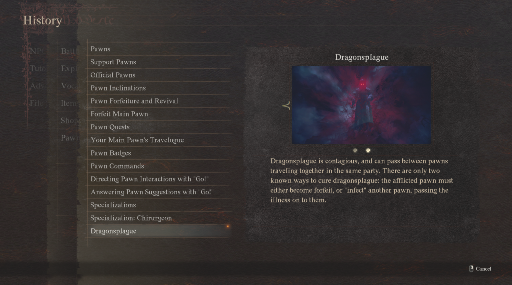 Once a Pawn goes berserk, the first option is the only solution to get rid of the Dragonsplague, and that’s killing the affected Pawn. If it is your Pawn, they can be revived at any Riftstone by touching it. This will cure them of Dragonsplague, but they will always run the risk of getting it again. If it is a borrowed Pawn that loses control, you will be forced to kill them, and they will reappear in the Rift at a later time. There is no certainty that they will be cured upon returning. Dragonsplague more or less forces you to rotate your roster of Pawns, which may be irritating for some, but as a narrative tool, it’s very cool.