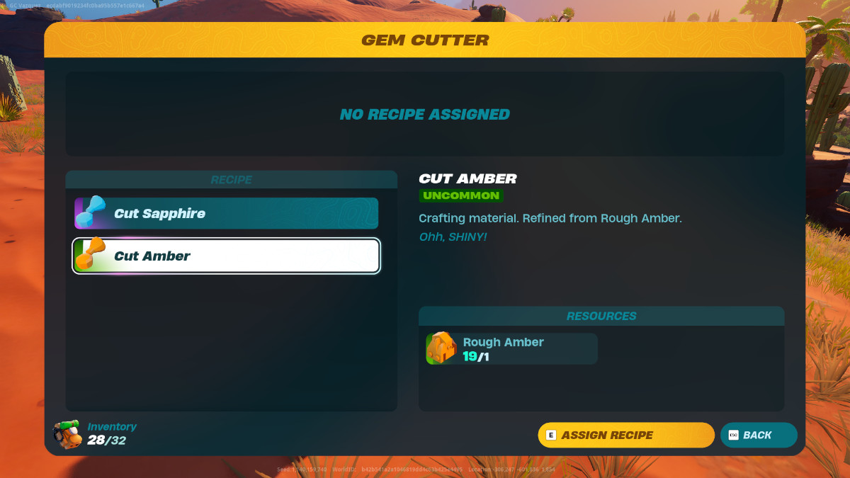 You can find Rough Amber in the Dry Valley biome. Once you find the biome, look for the tall, rocky spires scattered across the map. These are Dry Valley’s mesas, and the Amber deposits can be found growing out of the sides and on top of them. You’ll need at least an Uncommon Pickaxe to break the deposit apart. You can always build some stairs up to the amber, but if you have a glider handy, there should be some nearby geysers you can use to thrust yourself upward. Conveniently, obtaining rough amber will unlock the Gem Cutter recipe, the station you need to cut it! To make the gem cutter, you need the following ingredients: