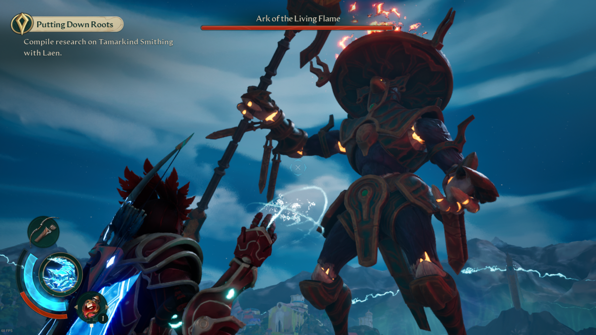 Unlike many of the other Arks you’ve encountered in Eternal Strands, the Ark of the Living Flame fits into more of a mage or spellcaster archetype. This means that while it has a number of long-ranged, fire-based attacks it’s also lacking in armor, so you can run right up and stack hacking at the weak points on its legs and chest. But, again, that’s assuming you can withstand it’s ranged barrages.