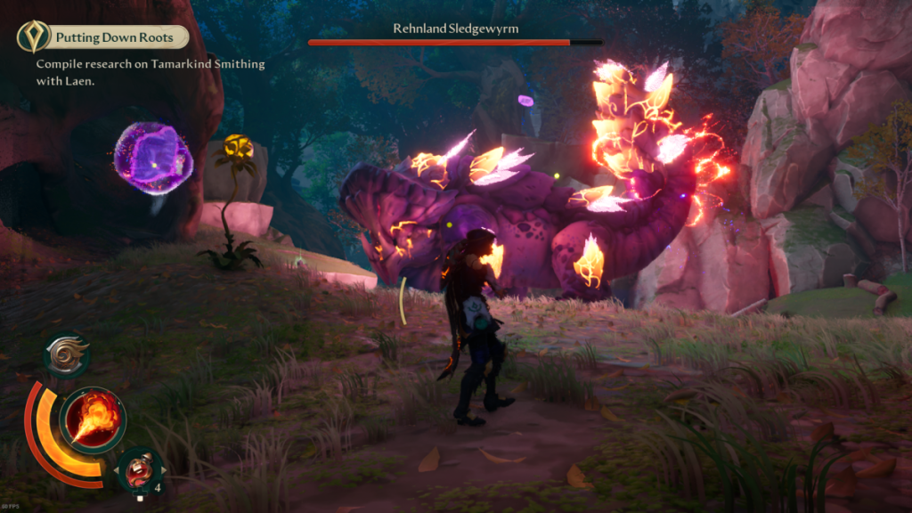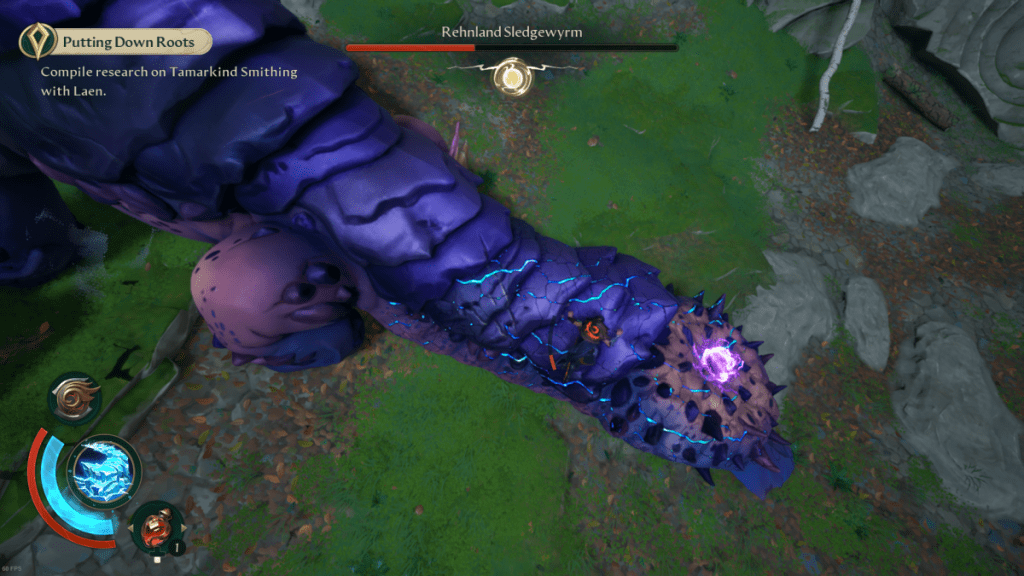 Remember those glowing, magic crests along the wyrm’s back? You’ll be needing to smash those to reveal the locus on its tail. Not being metal they actually break fairly easily without having to temper them, and if you have a good greatsword crafted they’ll often crumble from just two charged attacks. While you only need to break the ones along its back to reveal the locus, you should break the ones on the legs too as otherwise it can still use magic to throw you off during the harvest. Otherwise, the Rehnland Sledgewyrm is one of the simpler enemies to harvest in Eternal Strands.