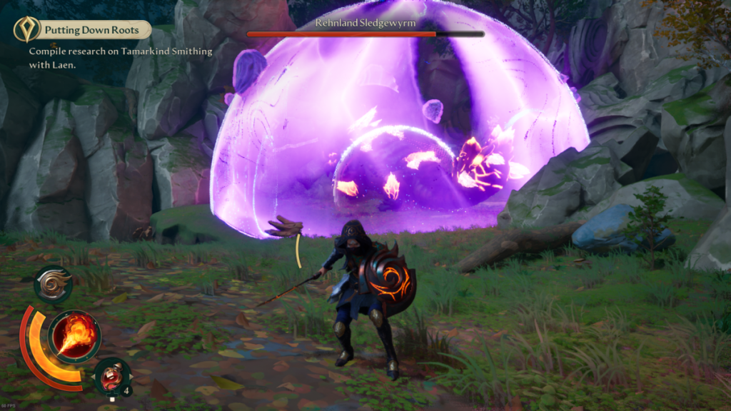 One particularly annoying attack involves it sucking you in before slamming its head down, doing lots of damage. Because it’s very difficult to resist the pull you’ll need to dodge-roll just as the spell stops and the wyrm begins to slam, which can require a bit of time to learn the timing of. It may also put up a purple bubble that throws you outwards, as well as lifting up three objects before throwing them. These two often work in your favor, as the thrown objects are much easier to dodge when you’re far away and can also be blocked with your shield or caught with Weaver’s Grasp (though you’ll still need a higher spell level for the larger objects). You can tell when it’s getting ready to use big magic attack because the crests along its back and legs will glow orange, and smashing these will cause it to use its magic far less.