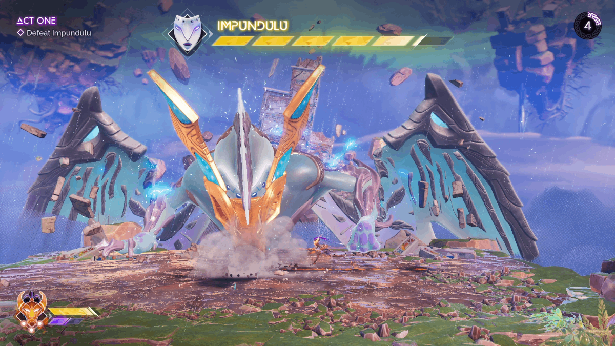 Don’t be afraid to dash if it looks a bit too close, though. Both these attacks leave Impundulu in a vulnerable state, which will allow you to combo with the Mask of the Sun until she recovers. After you’ve knocked off one segment of her health, she’ll add a new attack – a laser. This is marked by her rising above the platform and charging up. She will then sweep a laser from her mouth across the length of the stage, alternating the direction it travels in.