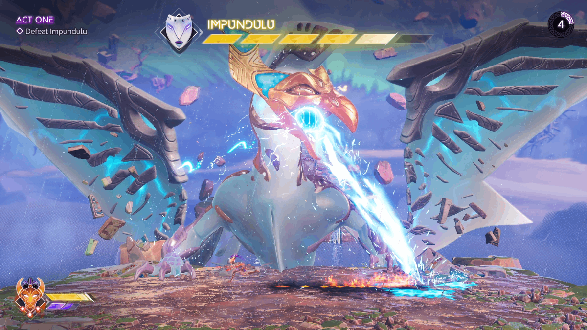 The laser attack also changes during this phase, as Impundulu will move to the edge of the stage rather than above it. You will still need to dodge the laser using the dash, just like the first phase, but the attack strategy changes a little due to your proximity to Impundulu after the dash. When close to her, use the Mask of the Sun, or fire through the laser with Mask of the Moon if you’re away from her. After knocking off four health segments, Impundulu repeats the lightning strikes from the end of the first phase.