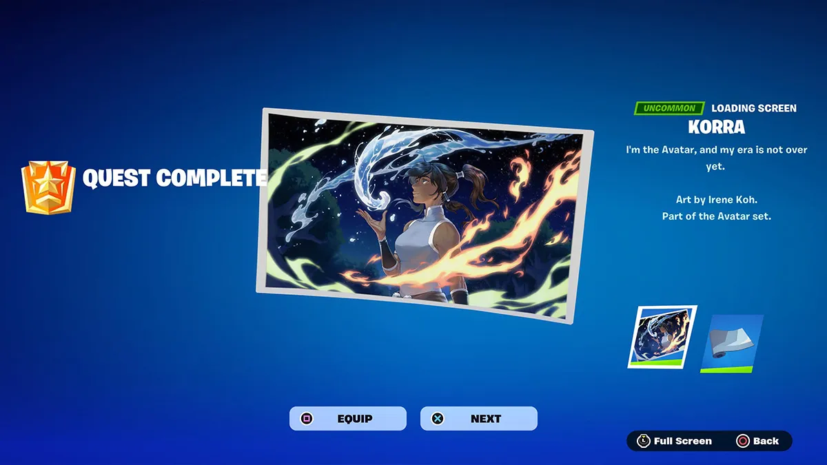 For completing the Emerge from Water Fortnite quest, you unlock the new “Korra Wallpaper” which was illustrated by Irene Koh. More importantly you will have step 1 out of 4 completed on Korra’s quest page. You will now only need to complete three more quests to unlock the Korra skin in Fortnite.