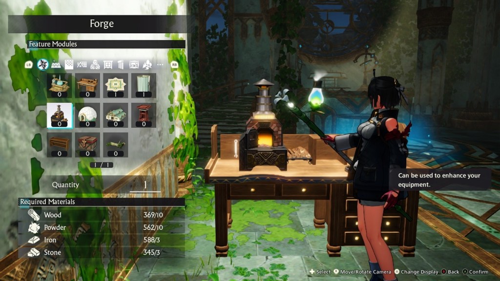 You should have plenty of wood, powder, iron and stone from collecting resources in the open terrain. You should place the forge in the building when you have created it. To do this, open up the shortcut wheel by pressing LB and then select “Building”. You will now have access to all the items you have created so far.