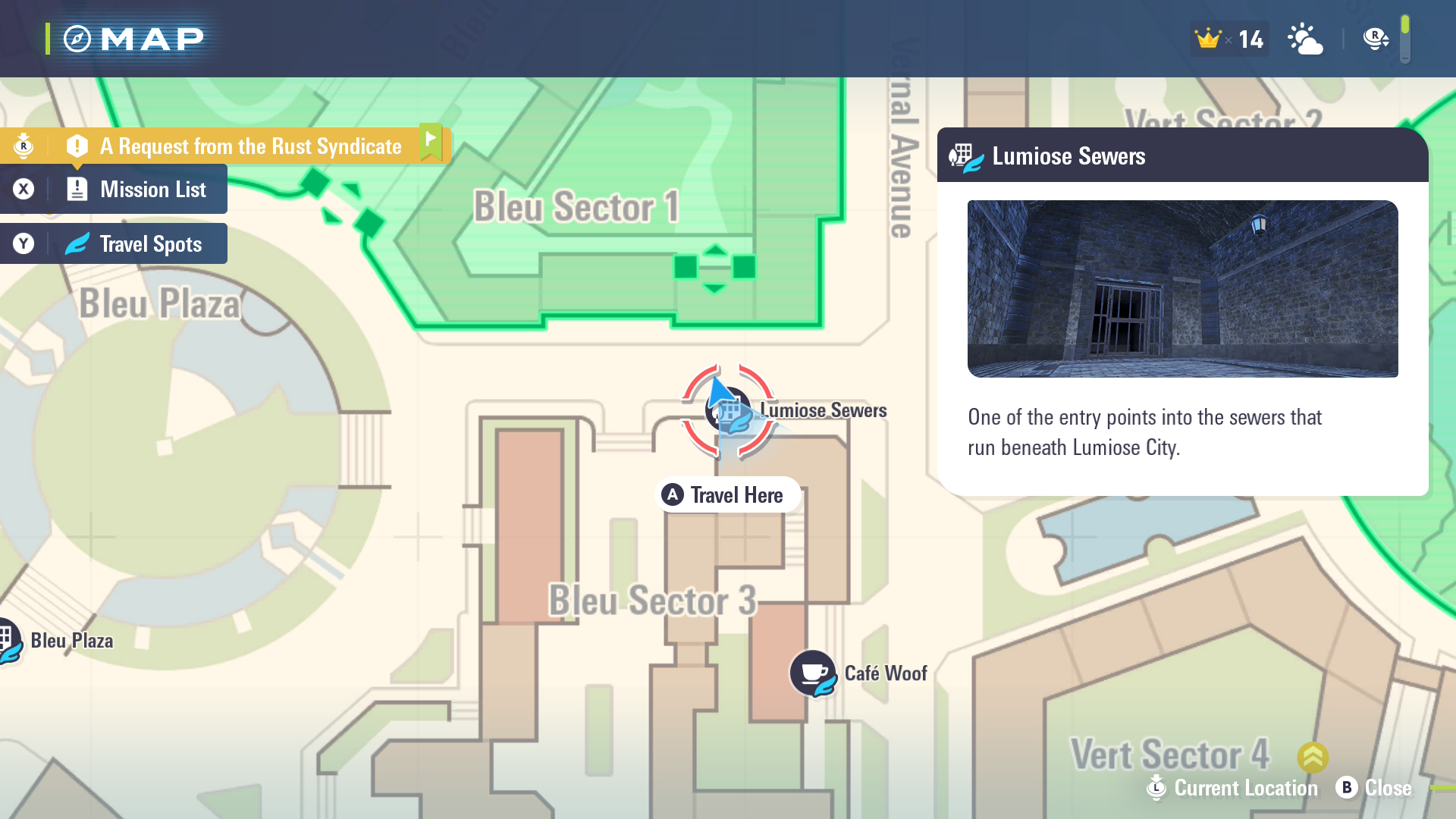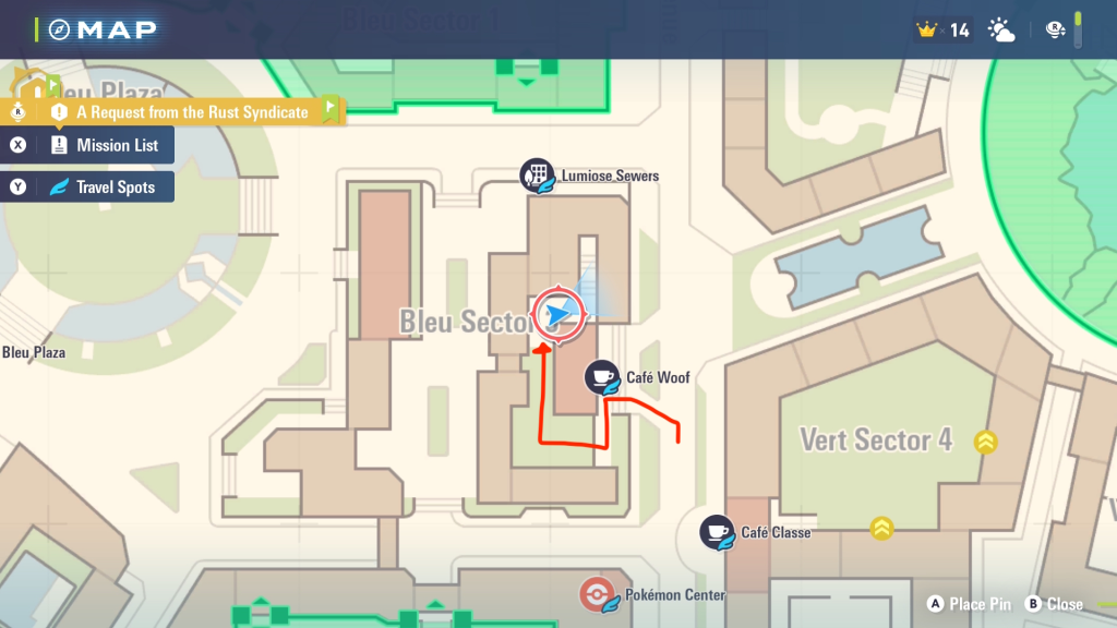 The key to getting back into the sewers is to wait for Side Mission 57 to show up. This is called “The Camerupt Entrepreneur.” You’ll want to look for Herup in the Bleu Sector. The blue exclamation point icon will show up around the Pokemon Center near Cafe Woof and Cafe Classe. (Both appear on the borderline street between Bleu Sector 3 and Vert Sector 4. After talking with Herup and his goals underground, he’ll tell you to meet him at the entrance to head into the sewers.