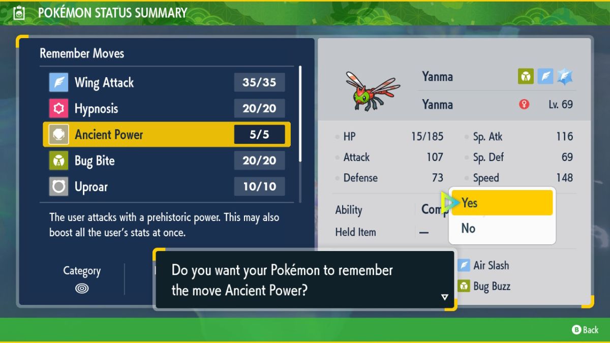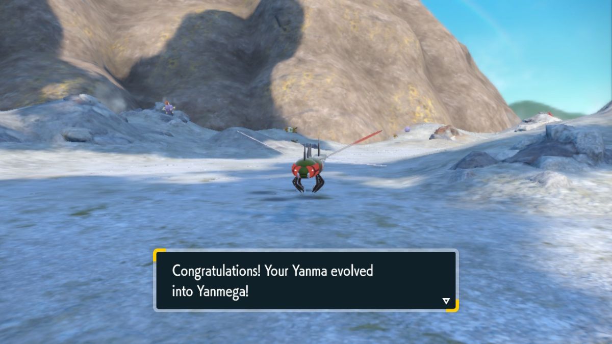 If you catch a Yanma and it’s over level 33, press the X button to open the main menu, click on Yanma, select “Check summary,” then tab over to its “Moves and Stats” screen. Here, press A and then choose “Remember moves” to bring up a menu showing all of the Pokemon’s moves it’s ever been able to learn. Select Ancient Power from this list to make it learn the move, then level up your Yanma once to trigger its evolution into Yanmega.